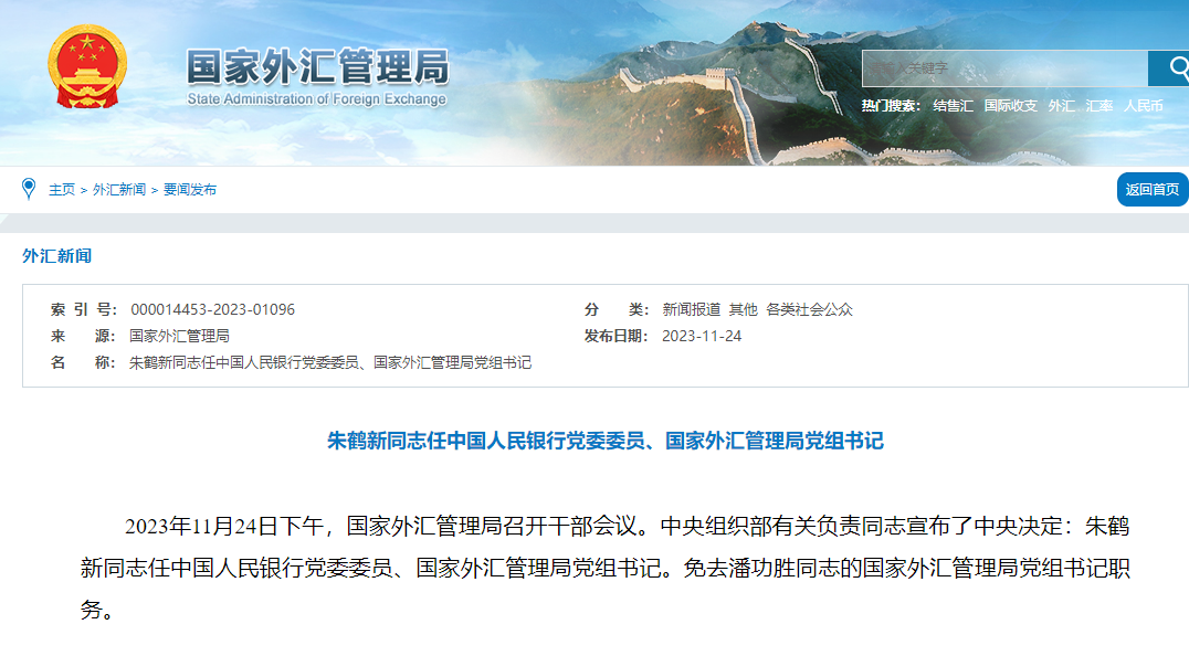 國家外匯管理局發(fā)布消息,2023年11月24日下午,國家外匯管理局召開干部會(huì)議。中央組織部有關(guān)負(fù)責(zé)同志宣布了中央決定:朱鶴新同志任中國人民銀行黨委委員、國家外匯管理局黨組書記。免去潘功勝同志的國家外匯管理局黨組書記職務(wù)。