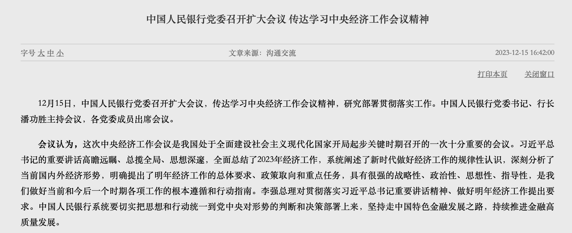 12月15日,中國(guó)人民銀行黨委召開擴(kuò)大會(huì)議,傳達(dá)學(xué)習(xí)中央經(jīng)濟(jì)工作會(huì)議精神,研究部署貫徹落實(shí)工作。會(huì)議強(qiáng)調(diào),做好明年的經(jīng)濟(jì)金融工作,要堅(jiān)持穩(wěn)中求進(jìn)工作總基調(diào),完整、準(zhǔn)確、全面貫徹新發(fā)展理念,加大宏觀調(diào)控力度,保持貨幣政策的穩(wěn)健性,防范化解金融風(fēng)險(xiǎn),深化金融改革開放,切實(shí)增強(qiáng)經(jīng)濟(jì)活力,改善社會(huì)預(yù)期,鞏固和增強(qiáng)經(jīng)濟(jì)回升向好態(tài)勢(shì),持續(xù)推動(dòng)經(jīng)濟(jì)實(shí)現(xiàn)質(zhì)的有效提升和量的合理增長(zhǎng)。著重抓好以下工作任務(wù):