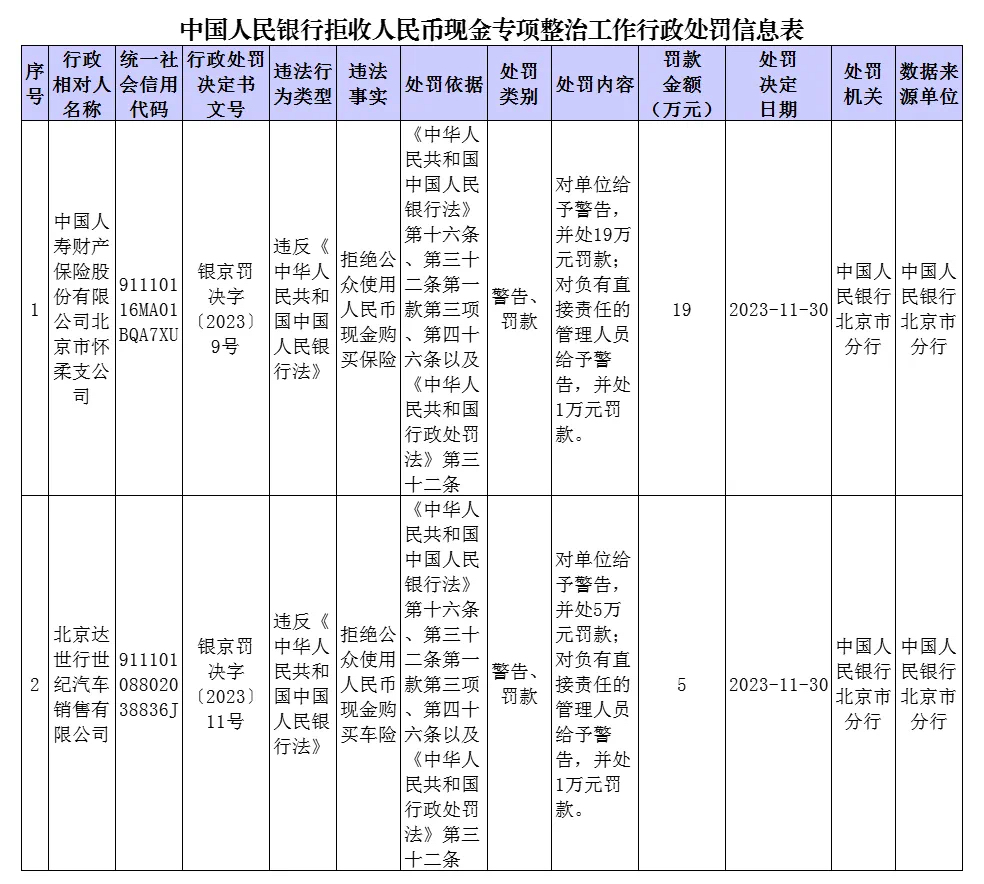 中國人民銀行依法對2家拒收人民幣現(xiàn)金的單位及相關(guān)責(zé)任人作出經(jīng)濟處罰。