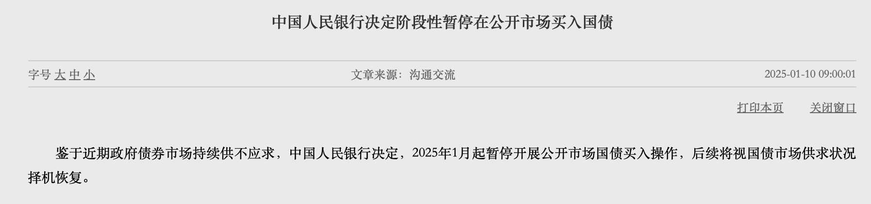 1月10日,中國(guó)人民銀行發(fā)布公告稱,鑒于近期政府債券市場(chǎng)持續(xù)供不應(yīng)求,中國(guó)人民銀行決定,2025年1月起暫停開展公開市場(chǎng)國(guó)債買入操作,后續(xù)將視國(guó)債市場(chǎng)供求狀況擇機(jī)恢復(fù)。