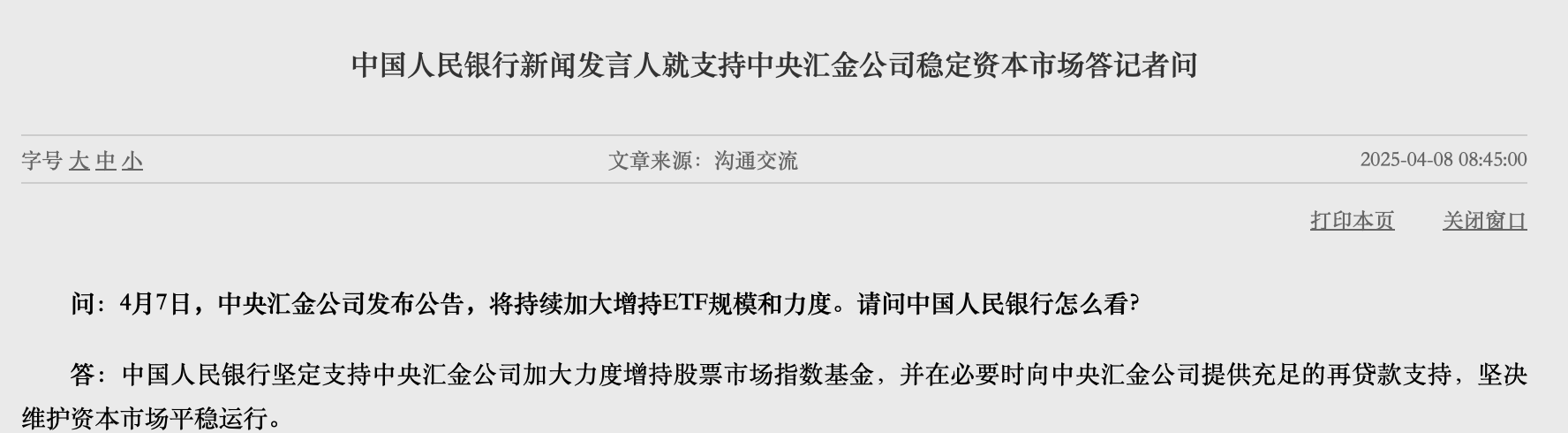 4月8日,中國人民銀行新聞發(fā)言人就支持中央?yún)R金公司穩(wěn)定資本市場答記者問表示,中國人民銀行堅(jiān)定支持中央?yún)R金公司加大力度增持股票市場指數(shù)基金,并在必要時(shí)向中央?yún)R金公司提供充足的再貸款支持,堅(jiān)決維護(hù)資本市場平穩(wěn)運(yùn)行。