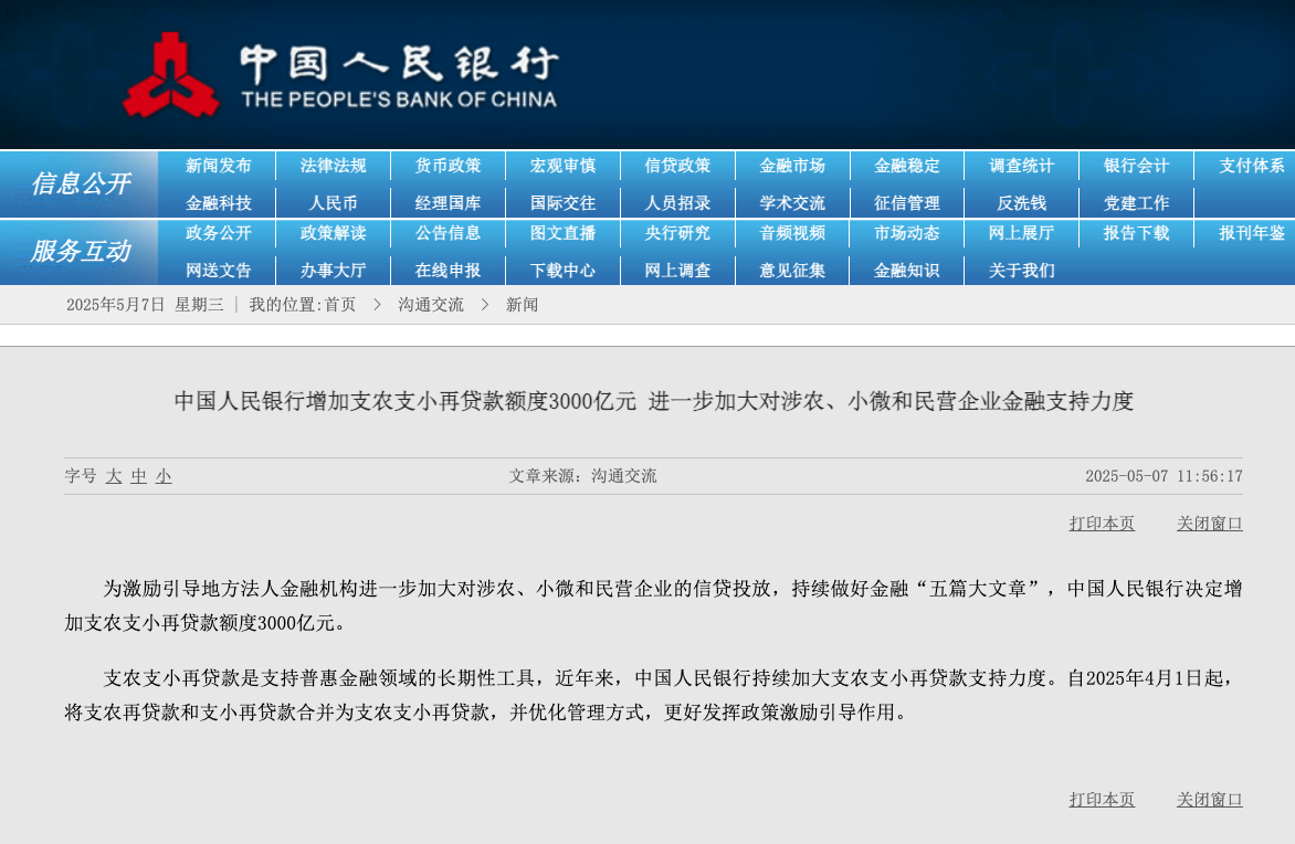 本報訊 (記者韓昱)中國人民銀行5月7日發(fā)布消息稱,為激勵引導地方法人金融機構進一步加大對涉農(nóng)、小微和民營企業(yè)的信貸投放,持續(xù)做好金融“五篇大文章”,中國人民銀行決定增加支農(nóng)支小再貸款額度3000億元。