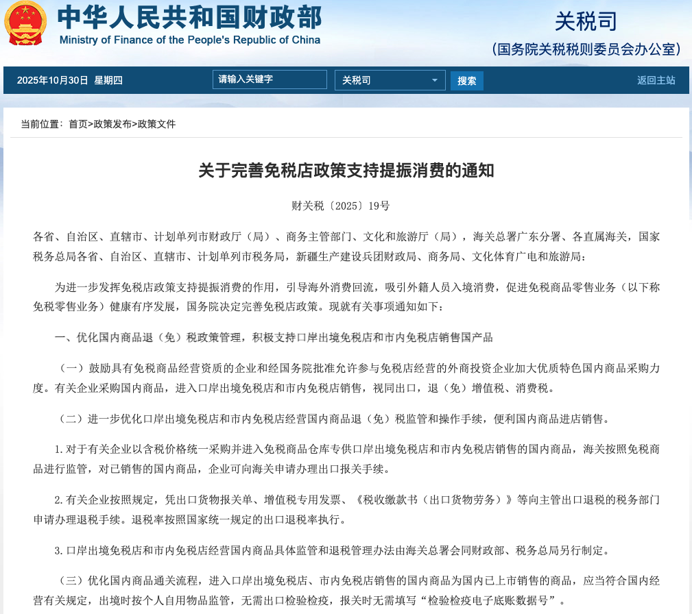 據(jù)財政部10月30日消息,近日,財政部、商務(wù)部、文化和旅游部、海關(guān)總署、稅務(wù)總局聯(lián)合印發(fā)《關(guān)于完善免稅店政策支持提振消費(fèi)的通知》(以下簡稱《通知》),明確自2025年11月1日起完善免稅店政策,旨在進(jìn)一步發(fā)揮免稅店政策支持提振消費(fèi)的作用,引導(dǎo)海外消費(fèi)回流,吸引外籍人員入境消費(fèi),促進(jìn)免稅商品零售業(yè)務(wù)健康有序發(fā)展。