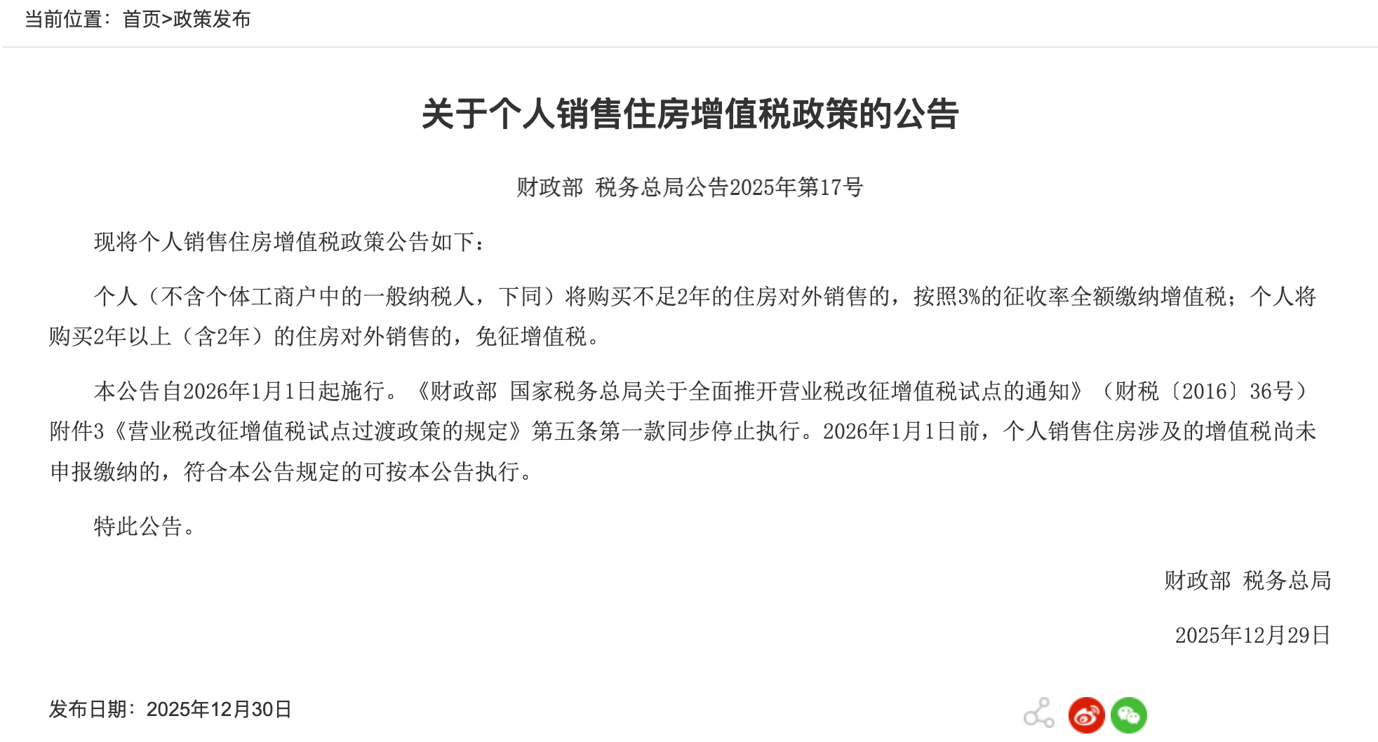 《公告》明確,2026年1月1日前,個(gè)人銷售住房涉及的增值稅尚未申報(bào)繳納的,符合該公告規(guī)定的可按該公告執(zhí)行。
