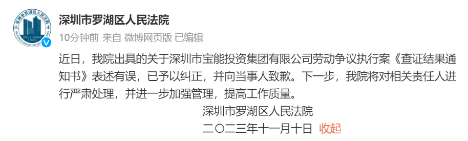 為此,《證券日報》記者聯(lián)系深圳市羅湖區(qū)人民法院進(jìn)行求證,法院在11月10日下午回復(fù)記者并在微博公布,“近日,我院出具的關(guān)于深圳市寶能投資集團(tuán)有限公司勞動爭議執(zhí)行案《查證結(jié)果通知書》表述有誤,已予以糾正,并向當(dāng)事人致歉。下一步,我院將對相關(guān)責(zé)任人進(jìn)行嚴(yán)肅處理,并進(jìn)一步加強(qiáng)管理,提高工作質(zhì)量。”