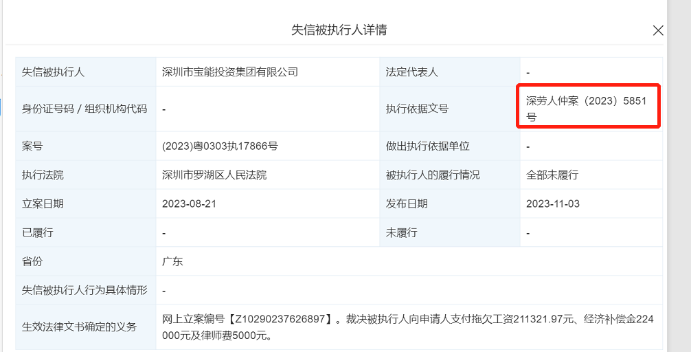 事情的緣由,在于寶能投資涉及一起勞動爭議案件,深圳市勞動人事爭議仲裁委員會深勞人仲案【2023】5851號仲裁裁決已經(jīng)發(fā)生法律效力,由于被執(zhí)行人(寶能投資)沒有履行生效法律文書所確定的內(nèi)容,申請執(zhí)行人向深圳市羅湖區(qū)人民法院申請強(qiáng)制執(zhí)行,深圳市羅湖區(qū)人民法院已依法受理。