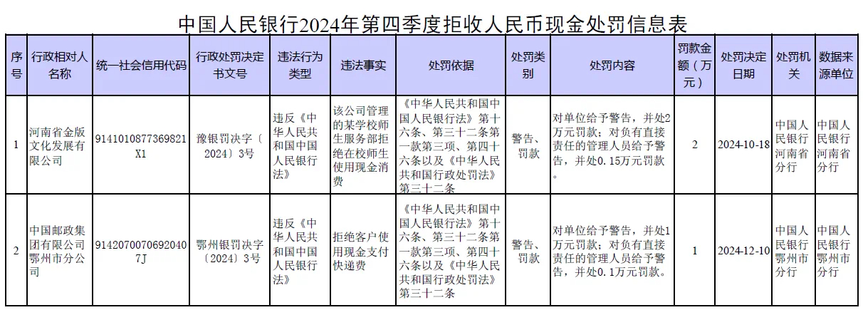 本報(bào)訊 (記者劉琪)1月23日,中國人民銀行(簡稱:央行)對2024年第四季度核實(shí)為拒收人民幣現(xiàn)金的2起經(jīng)濟(jì)處罰進(jìn)行公示。廣大經(jīng)營主體應(yīng)強(qiáng)化法治觀念,尊重公眾支付選擇權(quán),共同打造和諧現(xiàn)金流通環(huán)境。