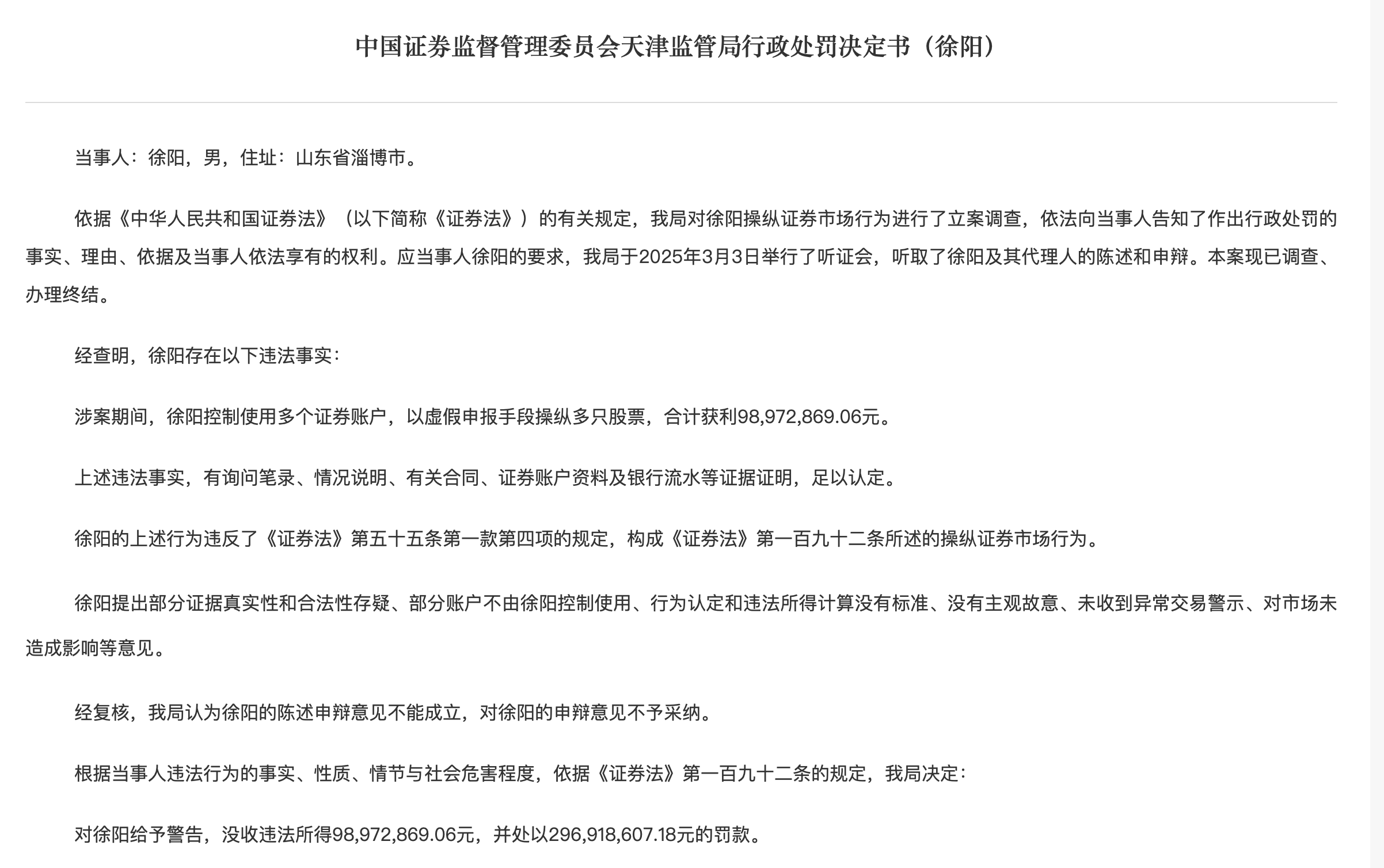 天津證監(jiān)局日前公布的一份行政處罰決定書(shū)顯示,徐陽(yáng)因操縱證券市場(chǎng)被罰沒(méi)近4億元。