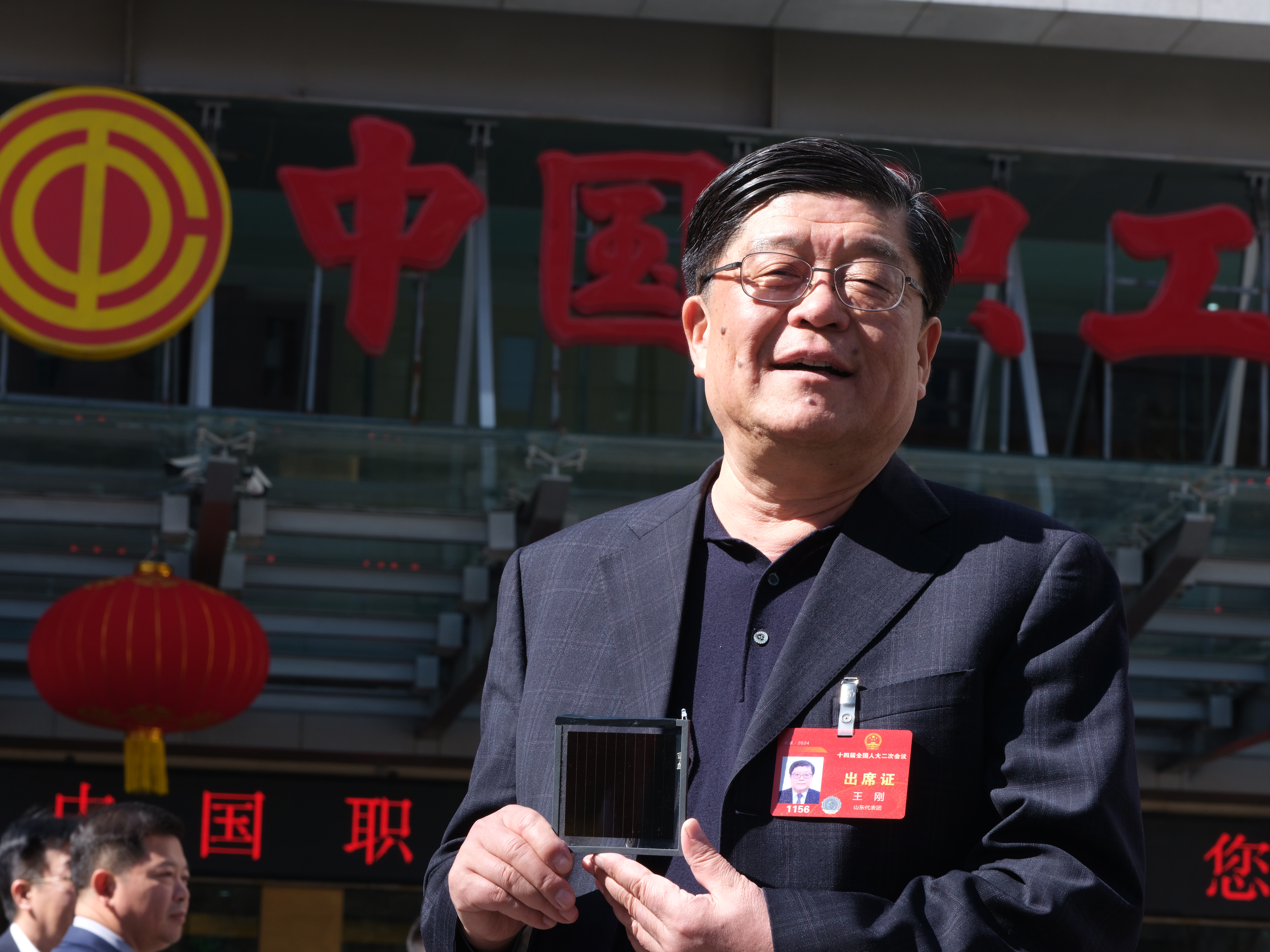 全國(guó)人大代表、金晶科技董事長(zhǎng)王剛手持金晶超白TCO導(dǎo)電膜玻璃新成果參加今年兩會(huì) 公司供圖