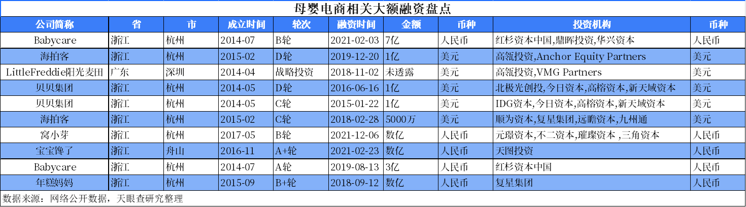 據(jù)天眼查不完全統(tǒng)計(jì),母嬰電商相關(guān)融資合計(jì)發(fā)生110余起,融資金額超70億元;