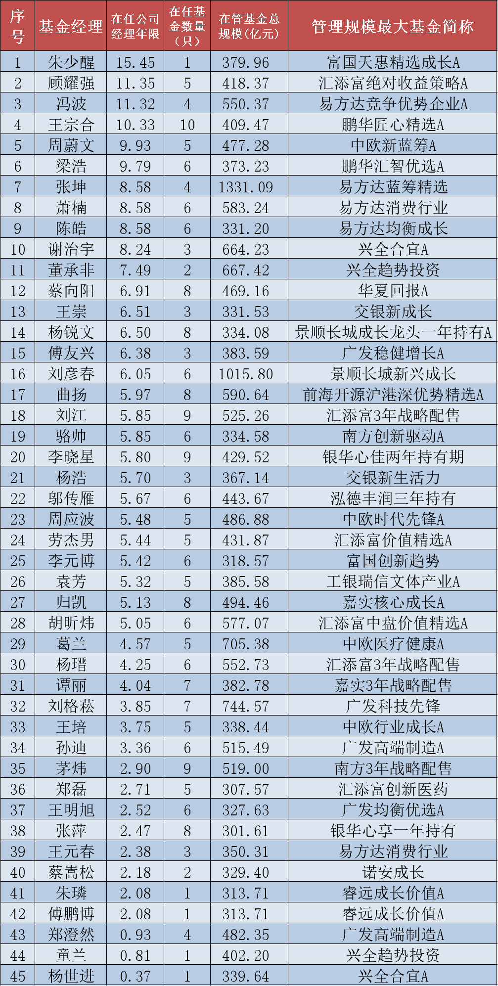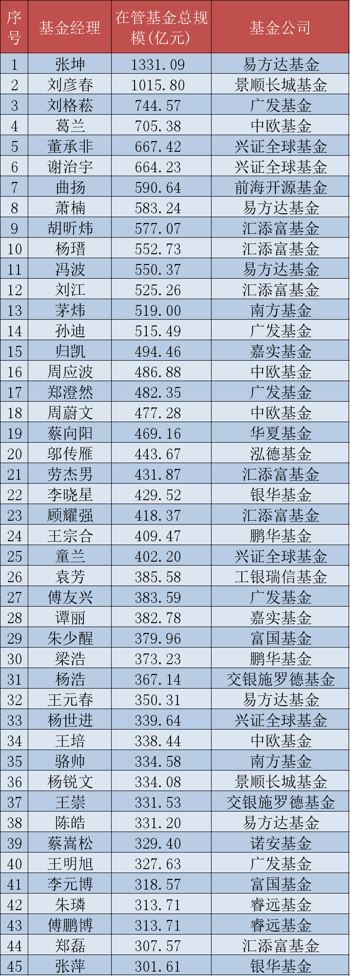 《證券日報》記者根據(jù)東方財富Choice數(shù)據(jù)和WinD數(shù)據(jù)梳理統(tǒng)計,篩選出一季度在管基金總規(guī)模300億元以上的偏股類基金經(jīng)理名單,共計45名。這些基金經(jīng)理大多是廣為基民熟知的明星基金經(jīng)理。