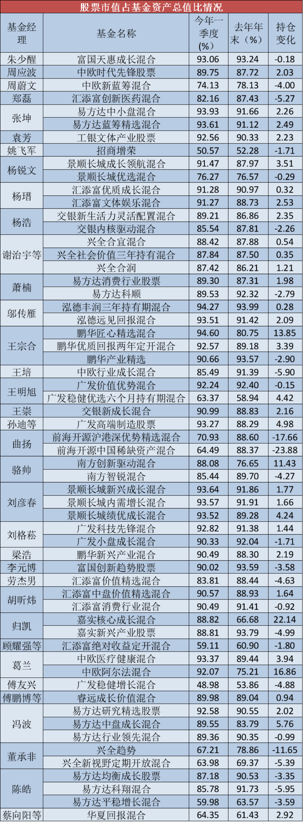 基金經(jīng)理的股票倉位情況也是市場十分關(guān)注的話題。從公募基金一季報披露情況看,面對劇烈的市場波動,公募基金倉位整體有小幅下降,但各個明星基金經(jīng)理因投資風(fēng)格及投資策略不同,股票倉位變化增減不一。