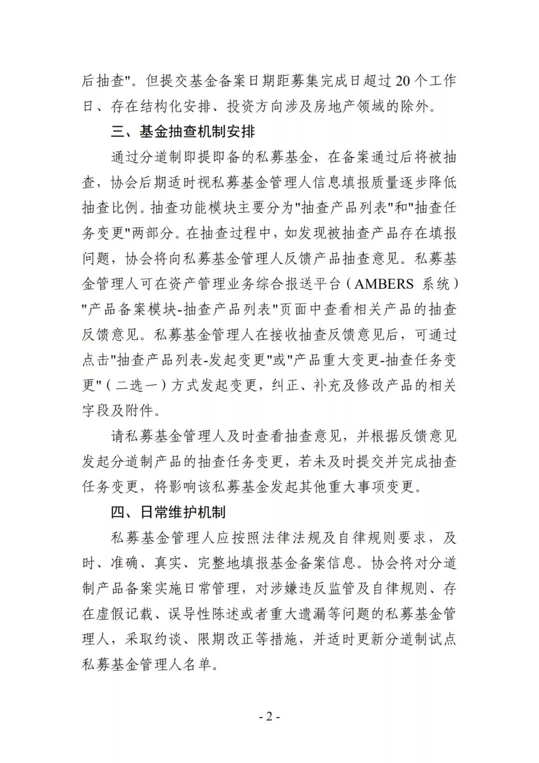 以下為中基協(xié)《關(guān)于開展私募股權(quán)基金分道制二期試點(diǎn)工作的通知》原文: