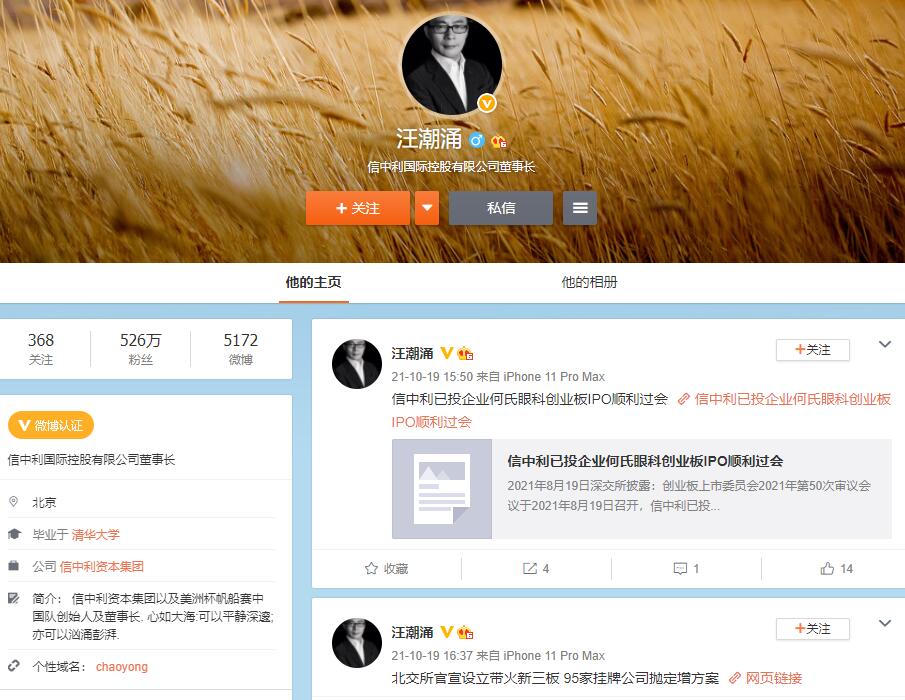 汪潮涌在新浪微博是坐擁526萬(wàn)粉絲的大V,其最后一條微博更新于10月19日。
