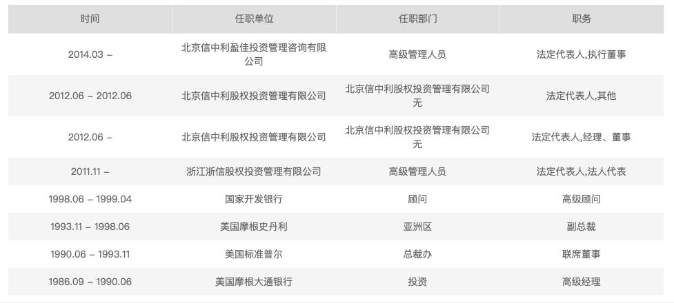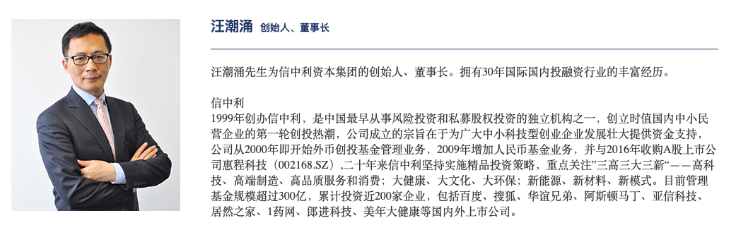 而汪潮涌的從業(yè)經(jīng)歷也相當(dāng)豐富,在1999年汪潮涌創(chuàng)辦信中利資本集團(tuán)并擔(dān)任董事長(zhǎng)之前,其還曾就職于國(guó)家開(kāi)發(fā)銀行、美國(guó)摩根大通銀行、美國(guó)標(biāo)準(zhǔn)普爾、摩根士丹利等眾多知名的金融機(jī)構(gòu)。