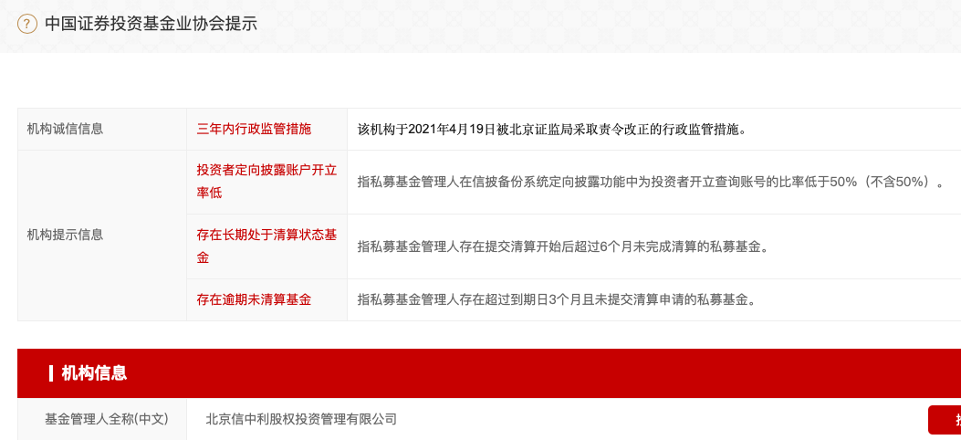 同時(shí),中基協(xié)信息顯示,信中利存在長(zhǎng)期處于清算狀態(tài)基金等問(wèn)題。