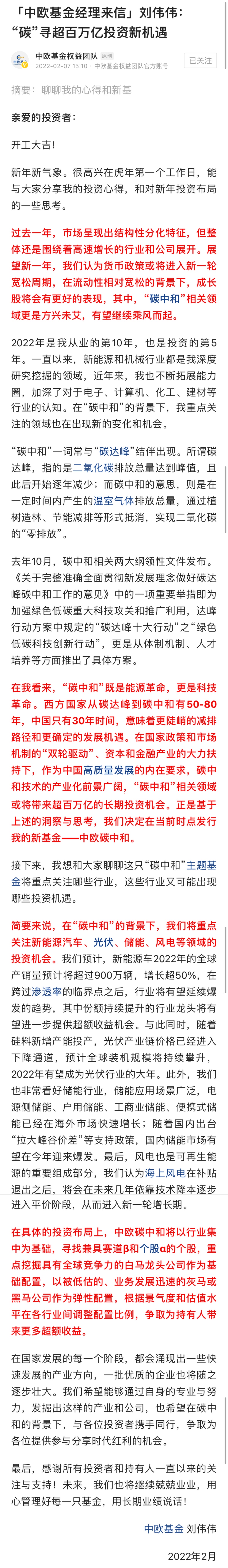 在致投資者的一封信中,劉偉偉提到,很高興在虎年第一個工作日,能與大家分享我的投資心得,和對新年投資布局的一些思考。展望2022年,在“碳中和”的背景下,我們將重點關(guān)注新能源汽車、光伏、儲能、風電等領(lǐng)域的投資機會。