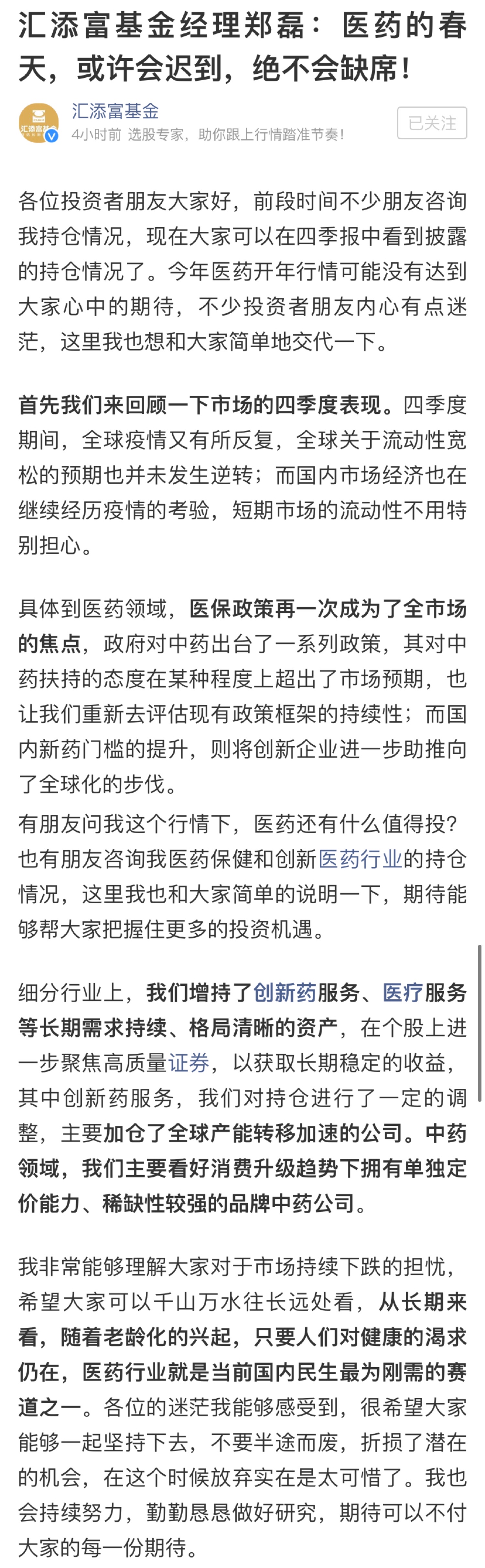 主攻醫(yī)藥賽道的鄭磊則對投資者坦言,”我非常能夠理解大家對于市場持續(xù)下跌的擔憂,希望大家可以千山萬水往長遠處看,從長期來看,隨著老齡化的興起,只要人們對健康的渴求仍在,醫(yī)藥行業(yè)就是當前國內(nèi)民生最為剛需的賽道之一。各位的迷茫我能夠感受到,很希望大家能夠一起堅持下去,不要半途而廢,折損了潛在的機會,在這個時候放棄實在是太可惜了。我也會持續(xù)努力,勤勤懇懇做好研究,期待可以不付大家的每一份期待。“