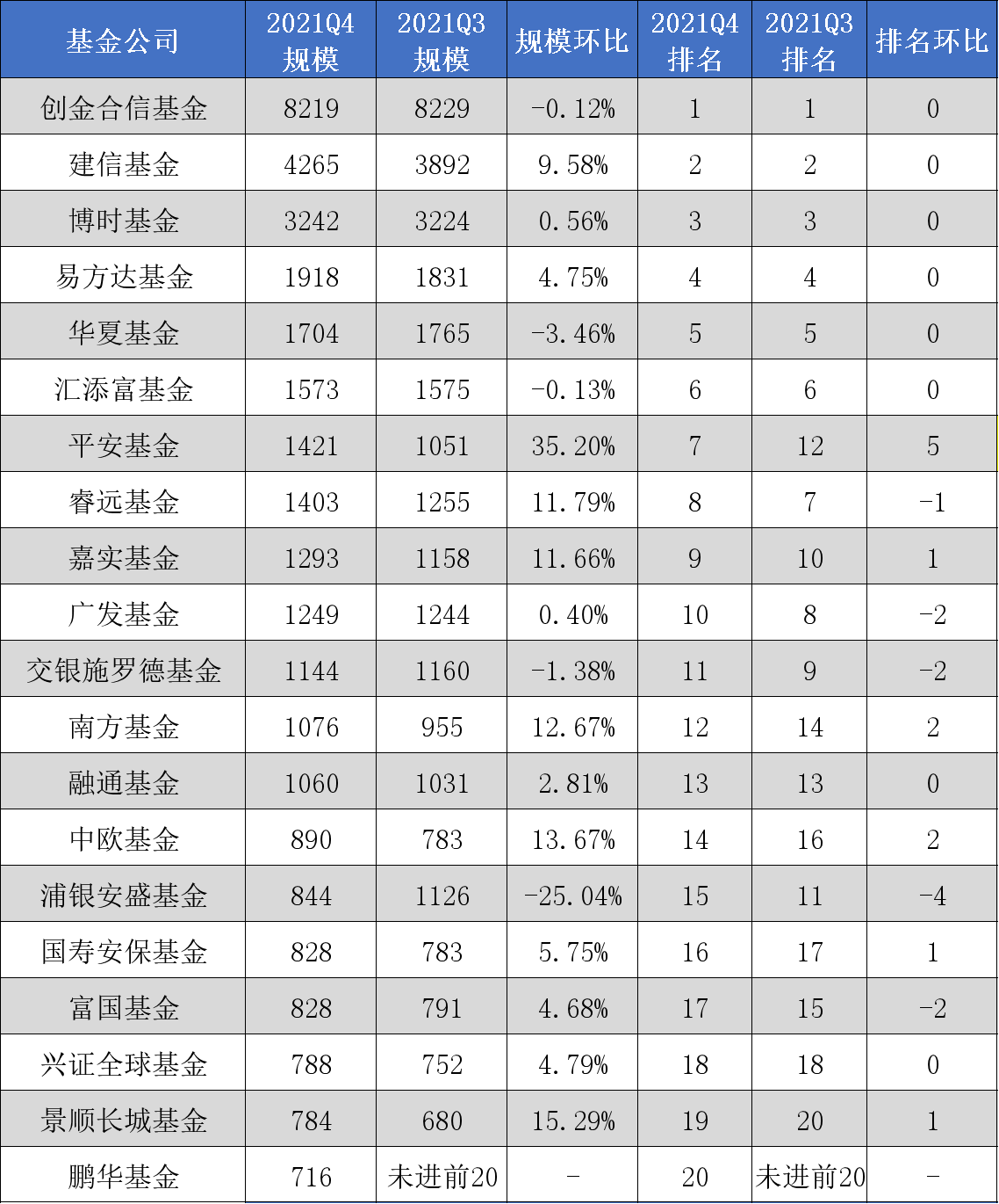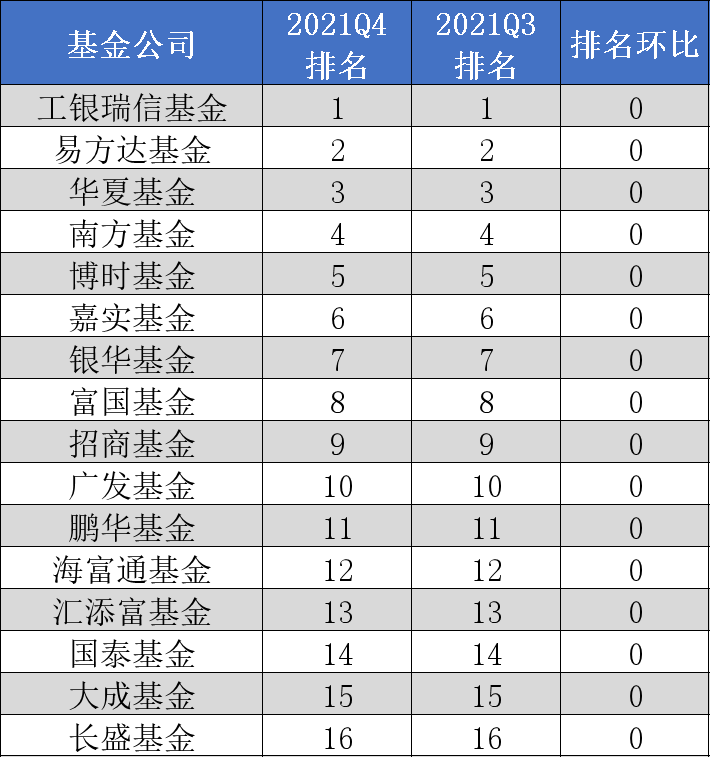 2月23日晚間,中國證券投資基金業(yè)協(xié)會發(fā)布2021年四季度各項資管業(yè)務月均規(guī)模數(shù)據。市場最為關注的非貨規(guī)模方面,前20名上榜基金公司與2021年三季度保持一致,且前五強座次的頭部基金公司地位穩(wěn)固,仍為易方達基金、廣發(fā)基金、匯添富基金、華夏基金、富國基金這五家。