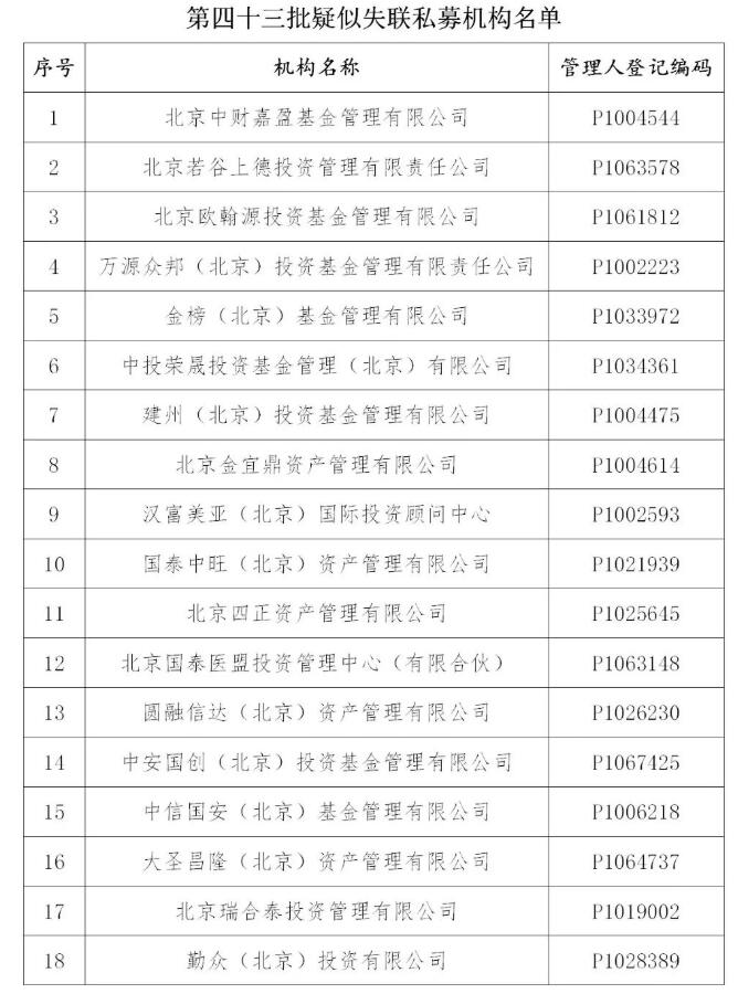 3月1日,中國證券投資基金業(yè)協(xié)會(以下簡稱“中基協(xié)”)發(fā)布公告稱,近期,中基協(xié)在日常工作中發(fā)現(xiàn)70家疑似失聯(lián)私募機構(gòu)(附件),通過該70家私募機構(gòu)在資產(chǎn)管理業(yè)務(wù)綜合報送平臺(以下簡稱AMBERS系統(tǒng))中登記的固定電話、手機號碼、電子郵件等聯(lián)系方式無法與其取得有效聯(lián)系。