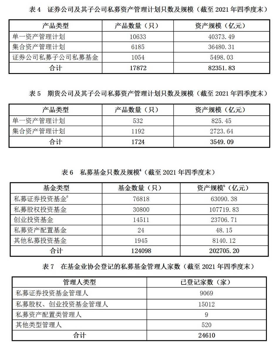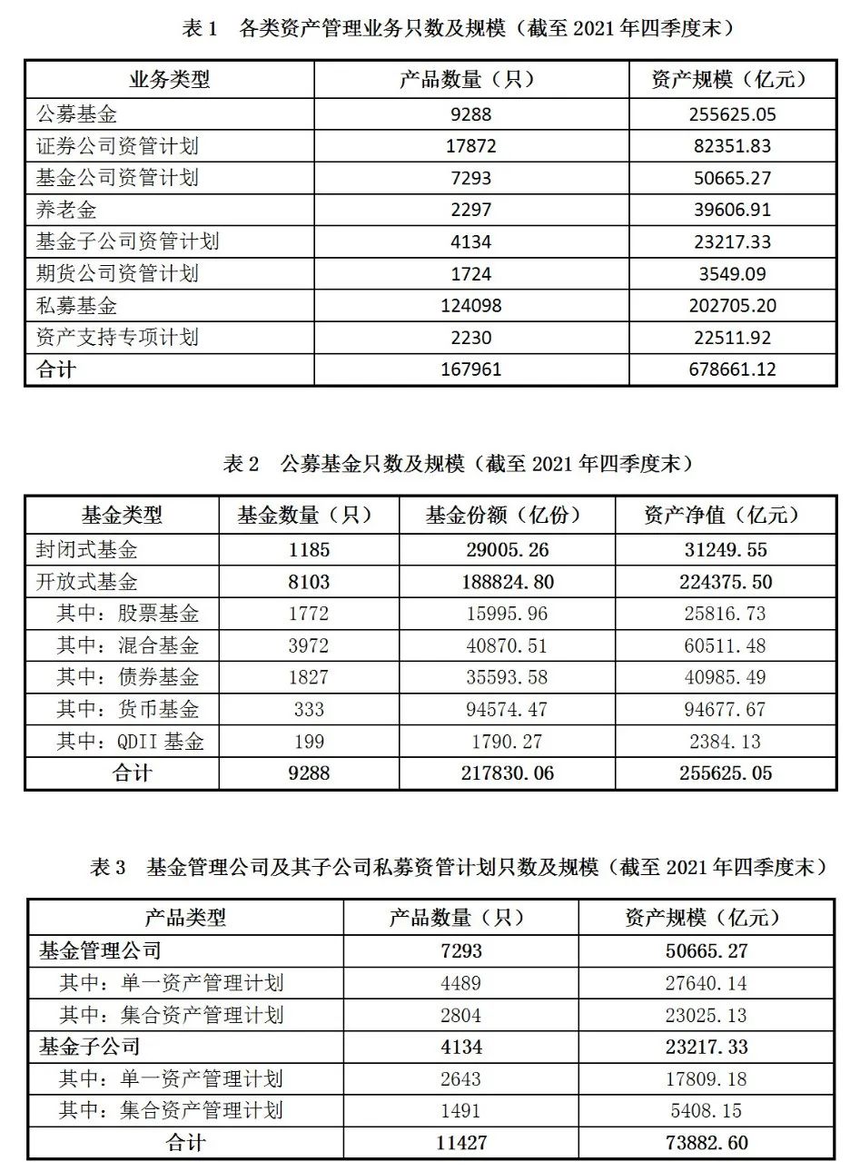 截至2021年四季度末,基金管理公司及其子公司、證券公司、期貨公司、私募基金管理機(jī)構(gòu)資產(chǎn)管理業(yè)務(wù)總規(guī)模約67.87萬(wàn)億元,其中,公募基金規(guī)模25.56萬(wàn)億元,證券公司及其子公司私募資產(chǎn)管理業(yè)務(wù)規(guī)模8.24萬(wàn)億元,基金管理公司及其子公司私募資產(chǎn)管理業(yè)務(wù)規(guī)模7.39萬(wàn)億元,基金公司管理的養(yǎng)老金規(guī)模3.96萬(wàn)億元,期貨公司及其子公司私募資產(chǎn)管理業(yè)務(wù)規(guī)模約3549億元,私募基金規(guī)模20.27萬(wàn)億元,資產(chǎn)支持專(zhuān)項(xiàng)計(jì)劃規(guī)模2.25萬(wàn)億元。