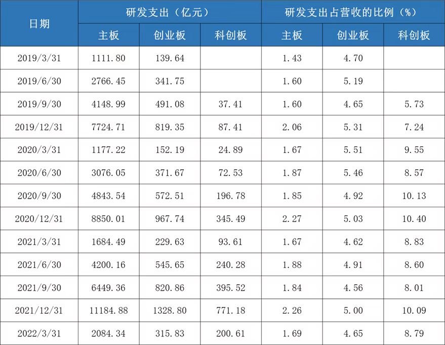 由于整體體量較小,從研發(fā)的絕對(duì)金額和人數(shù)上,科創(chuàng)板不如創(chuàng)業(yè)板和主板,但是從研發(fā)費(fèi)用率和研發(fā)人員占比角度可以看到,科創(chuàng)板的“研發(fā)驅(qū)動(dòng)”含量是目前所有板塊中最高的。