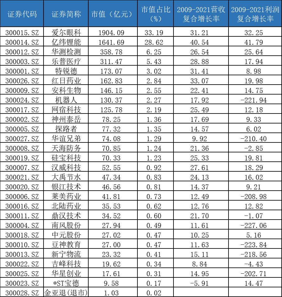 創(chuàng)業(yè)板首批28家公司在2009年10月底掛牌上市,十余年之后回首再看,其中多家公司已經(jīng)被借殼或者并購(gòu)重組改名,甚至還有一家公司目前處于*ST狀態(tài),還有一家已經(jīng)退市(金亞退),但是也不乏諸如愛(ài)爾眼科和億緯鋰能等如今創(chuàng)業(yè)板指數(shù)的權(quán)重股: