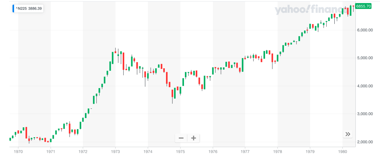 以下是日經(jīng)225指數(shù)1970-1980年走勢(shì)圖: