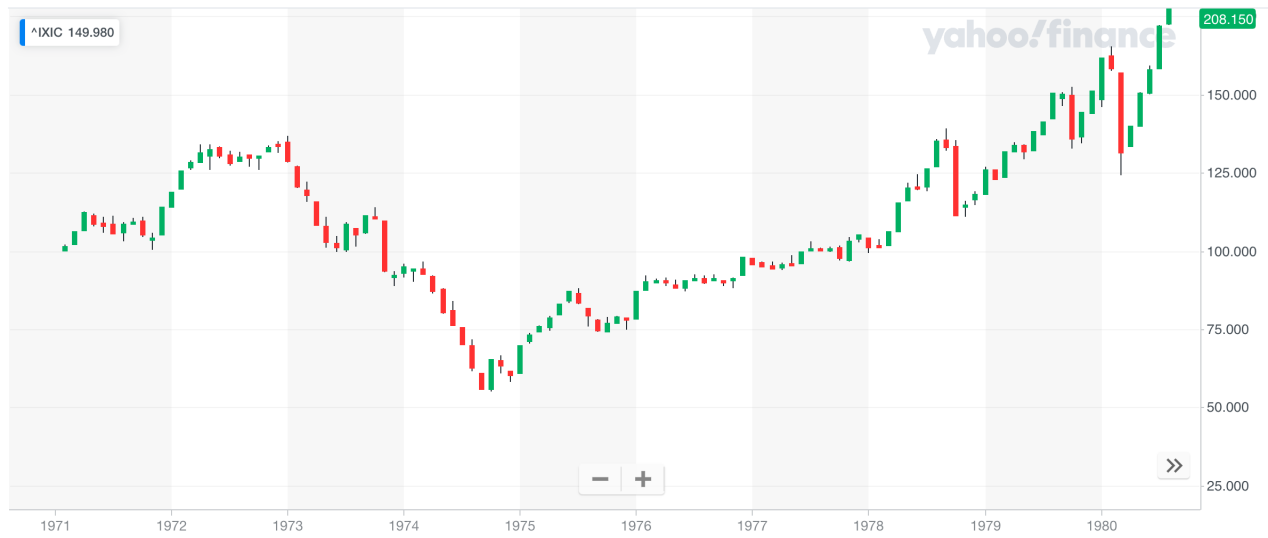 以下是1971-1980年納斯達(dá)克指數(shù)走勢(shì):