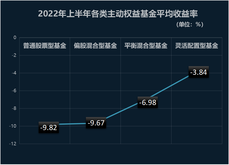 若剔除指數(shù)型基金,主動權(quán)益類基金上半年平均收益率回升至-7.25%。其中股票倉位在60%以上的偏股混合型基金平均收益率為-9.67%,股票倉位在80%以上的普通股票型基金的平均收益率為-9.82%,靈活配置型基金的平均收益率為-6.98%,而平衡混合型基金的平均收益率為-3.84%,整體跑贏大盤。
