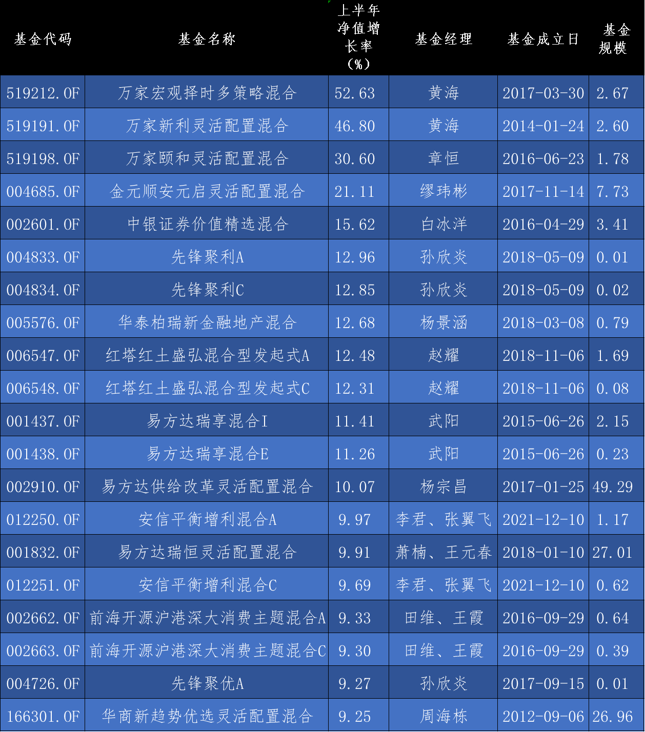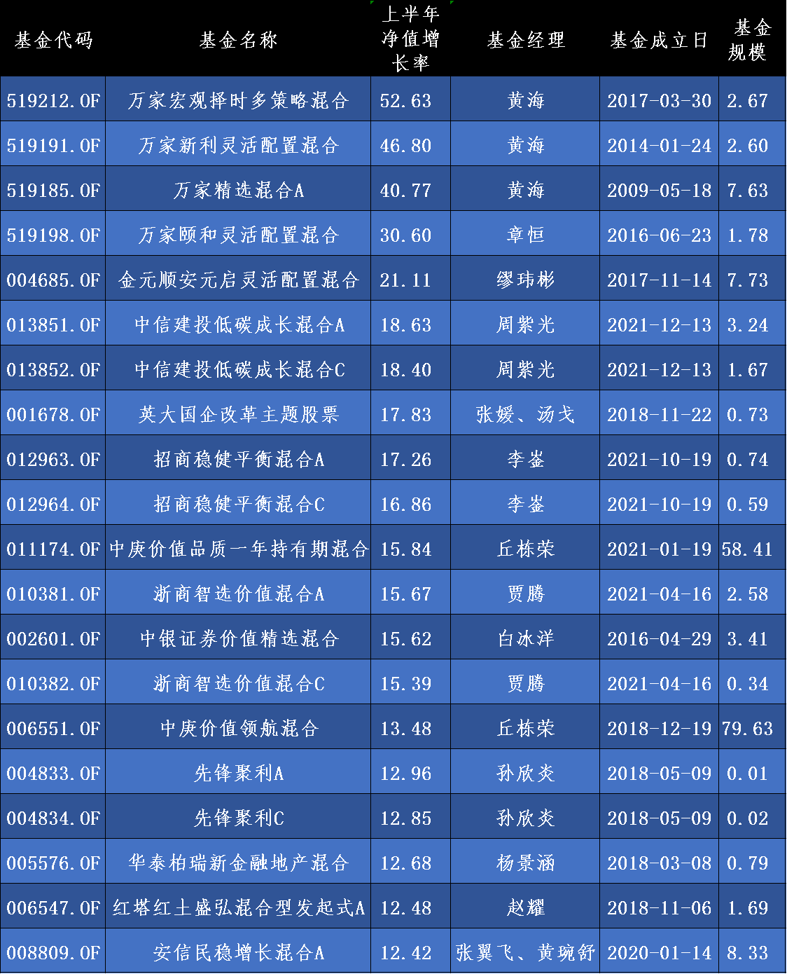 黃海所管理的另兩只產(chǎn)品萬家新利靈活配置混合和萬家精選混合A同時(shí)摘得“榜眼”和“探花”之位,上半年收益率達(dá)46.8%和40.77%。據(jù)記者了解,上述三只基金自黃海上任以來的回報(bào)率分別為24.19%、29.94%和25.64%,任期均為1年9個(gè)月左右,合計(jì)規(guī)模約為12.9億元,是一只典型的“小而美”基金,所以“買中”上述三只基金的基民也并不多。最新公告數(shù)據(jù)顯示,萬家宏觀擇時(shí)多策略混合、萬家新利靈活配置混合和萬家精選混合A的持有人合計(jì)僅有7.77萬戶。
