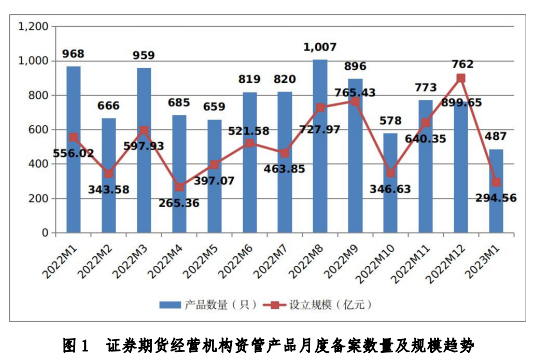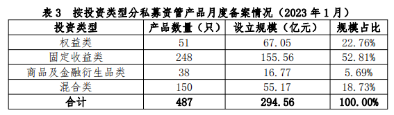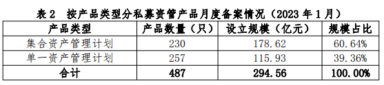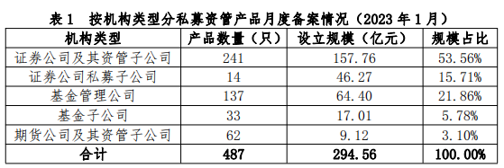 從私募資管產品備案情況來看,2023年1月份,證券期貨經營機構當月共備案私募資管產品487只,設立規(guī)模294.56億元。當月新設產品平均備案核查時間為2.4個工作日。