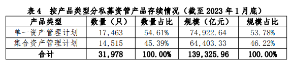 從私募資管產品存續(xù)情況來看,截至2023年1月底,證券期貨經營機構私募資管業(yè)務規(guī)模合計13.93萬億元(不含社?;?、企業(yè)年金),較上月底減少3754.94億元,下降2.62%。