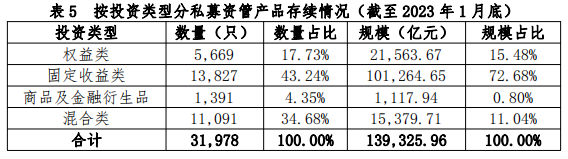 從投資類型看,1月份備案私募資管產品數量最多、設立規(guī)模最大的為固定收益類。