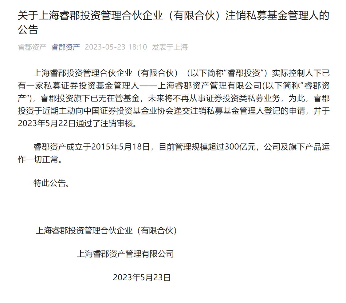 5月23日下午6點(diǎn)10分,??べY產(chǎn)官網(wǎng)發(fā)布《關(guān)于上海??ね顿Y管理合伙企業(yè)(有限合伙)注銷私募基金管理人的公告》。公告聲明稱,上海??ね顿Y管理合伙企業(yè)(有限合伙)(以下簡稱“??ね顿Y”)實(shí)際控制人下已有一家私募證券投資基金管理人——上海??べY產(chǎn)管理有限公司(以下簡稱“睿郡資產(chǎn)”),睿郡投資旗下已無在管基金,未來將不再從事證券投資類私募業(yè)務(wù),為此,??ね顿Y于近期主動向中基協(xié)遞交注銷私募基金管理人登記的申請,并于2023年5月22日通過了注銷審核。