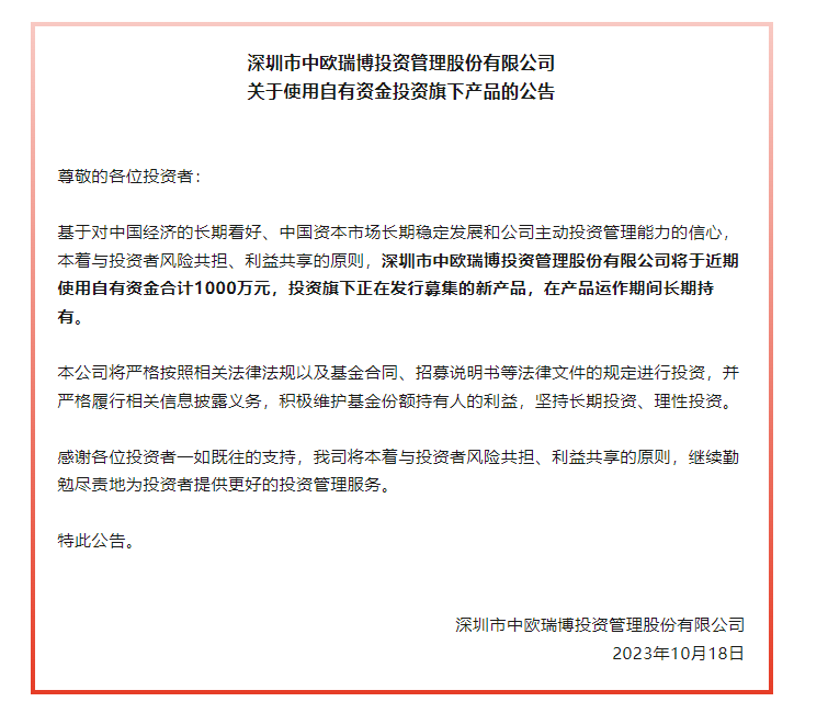 公告顯示,基于對中國經(jīng)濟的長期看好、中國資本市場長期穩(wěn)定發(fā)展和公司主動投資管理能力的信心,本著與投資者風險共擔、利益共享的原則,中歐瑞博將于近期使用自有資金合計1000萬元,投資旗下正在發(fā)行募集的新產(chǎn)品,在產(chǎn)品運作期間長期持有。