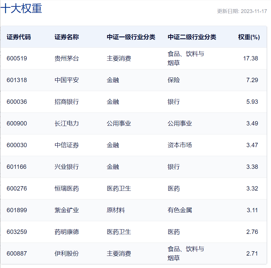 匯聚優(yōu)質(zhì)大盤藍(lán)籌股是上證50指數(shù)的一大亮點(diǎn),成份股中行業(yè)龍頭企業(yè)繁多。其中,成份股中權(quán)重較高的有消費(fèi)行業(yè)龍頭企業(yè)貴州茅臺(tái)、伊利股份等,金融行業(yè)中的中國平安、招商銀行等,公共事業(yè)行業(yè)的長江電力、原材料行業(yè)的紫金礦業(yè)、醫(yī)藥衛(wèi)生行業(yè)的恒瑞醫(yī)藥等。
