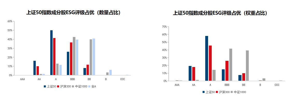 值得注意的是,近年來ESG投資理念持續(xù)滲透,注重投資組合的ESG評(píng)級(jí)有助于提升業(yè)績報(bào)酬、規(guī)避尾部風(fēng)險(xiǎn)。在主要寬基指數(shù)中,上證50指數(shù)更符合ESG投資理念,其ESG屬性較為突出。