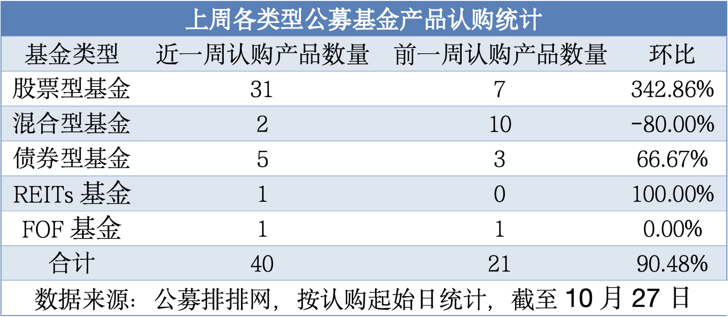 公募排排網(wǎng)數(shù)據(jù)顯示,截至10月27日,按基金認(rèn)購起始日統(tǒng)計,近一周共有40只基金開啟認(rèn)購,較前一周的21只相比,環(huán)比大幅增長90.48%。
