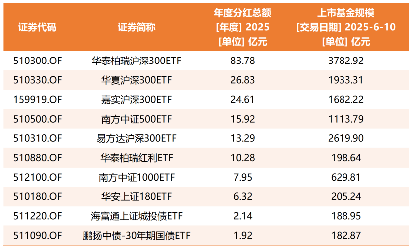 Wind資訊數(shù)據顯示,截至6月10日,華泰柏瑞滬深300ETF規(guī)模達3782.92億元,基金份額為952.06億份。這意味著,若權益登記日前產品份額無較大變化,根據基金分紅公告,本次華泰柏瑞滬深300ETF分紅總額將超過80億元,這一數(shù)字有望刷新境內ETF有史以來最高單次分紅紀錄。