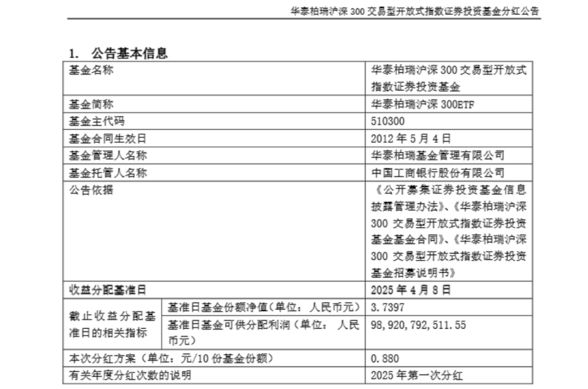 6月11日,華泰柏瑞基金發(fā)布公告稱,旗下滬深300ETF將實施現(xiàn)金分紅,分紅方案為每10份基金份額分紅0.880元,分紅權益登記日為2025年6月17日,除息日為2025年6月18日,現(xiàn)金紅利發(fā)放日為2025年6月27日。