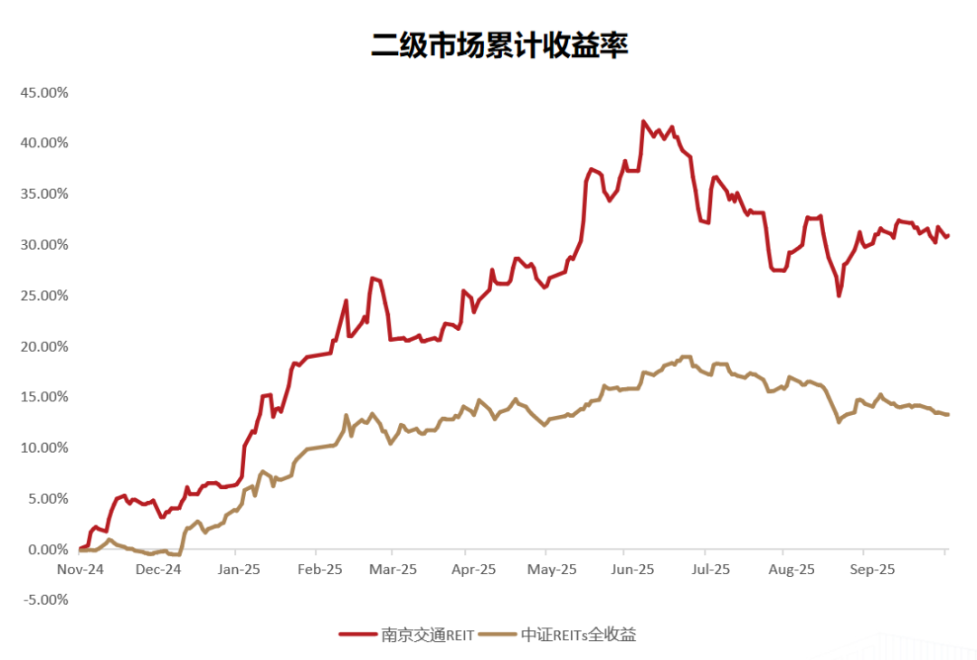 二級市場穩(wěn)健顯優(yōu)勢:截至2025年9月30日,產(chǎn)品上市以來二級市場漲幅為30.84%,本產(chǎn)品二級市場漲幅領(lǐng)先中證REITs全收益指數(shù)(13.18%),是投資者積極配置的優(yōu)質(zhì)標的,展現(xiàn)了市場對本產(chǎn)品經(jīng)營能力對長期價值的認可。