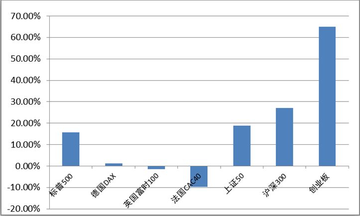 2020年的新冠疫情造成了巨大的沖擊,各國央行為應對經(jīng)濟下滑積極釋放流動性,但因為隔離等防疫政策導致的制造業(yè)停滯,大量無處可去的資金流入了資本市場。我們看到,全球股市在一季度大跌之后,均陸續(xù)開啟反彈行情,其中A股依靠更快的基本面復蘇表現(xiàn)亮眼。全年來看,標普500上漲15.62%,德國DAX也累計微漲1.28%,但同期英國富時100和法國CAC40仍累計下跌1.54%和9.78%。得益于中國對疫情的成功控制和順利復工復產(chǎn)所帶來的基本面優(yōu)勢,上證50、滬深300和創(chuàng)業(yè)板在2020年分別上漲18.85%、27.21%和64.96%,在全球市場中名列前茅。