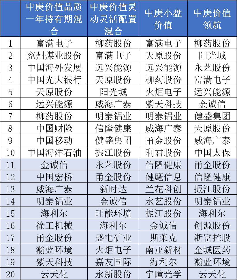 半年報(bào)顯示,中庚價(jià)值品質(zhì)一年持有期混合在上半年共計(jì)投資過135只個(gè)股(中庚價(jià)值靈動(dòng)靈活配置混合183只,中庚價(jià)值領(lǐng)航混合210只,中庚小盤價(jià)值235只)。除了二季報(bào)披露過的富滿電子、兗州煤業(yè)股份、中國(guó)海外發(fā)展、中國(guó)光大銀行、天原股份、遠(yuǎn)興能源、柳藥股份、中國(guó)財(cái)險(xiǎn)、中國(guó)移動(dòng)、中國(guó)海洋石油這前十大重倉(cāng)股之外,第十一至第二十只重倉(cāng)股分別為:金誠(chéng)信、中國(guó)宏橋、威海廣泰、明泰鋁業(yè)、海利爾、徐工機(jī)械、甬金股份、瀚藍(lán)環(huán)境、紫天科技、云天化。