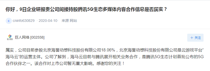 4月30日,巨人網(wǎng)絡(luò)在互動(dòng)易上回復(fù)投資者關(guān)于是否間接持股騰訊5G生態(tài)合作伙伴海馬云,稱屬實(shí)。目前巨人持有北京海譽(yù)動(dòng)想科技股份有限公司(簡(jiǎn)稱“北京海譽(yù)動(dòng)想”)18.06%的股份,海馬云是后者旗下產(chǎn)品。