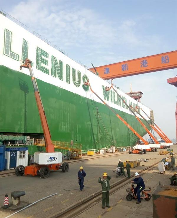星邦智能的高空作業(yè)車在船塢內(nèi)對(duì)船體施工(供圖:肖偉)