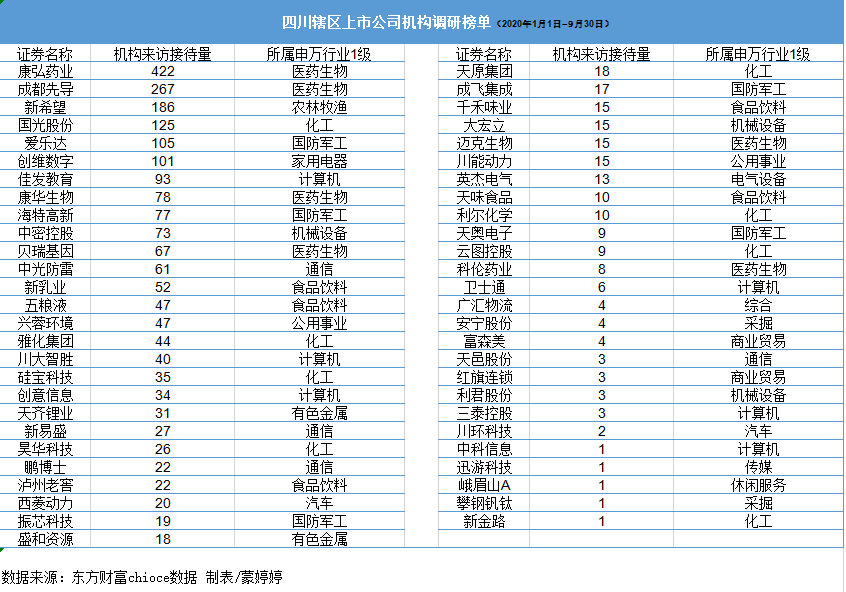 從機構調(diào)研榜中上市企業(yè)所屬行業(yè)來看,醫(yī)藥生物、化工、國防軍工、農(nóng)林牧漁、計算機行業(yè)分別以857家、268家、227家、186家、177家的機構調(diào)研量,成為今年前三季度四川轄區(qū)獲機構關注度較高的前五大行業(yè)。