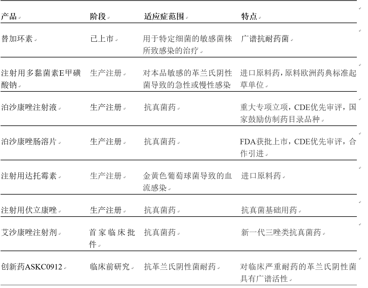 與此同時,奧賽康積極優(yōu)化產(chǎn)業(yè)結(jié)構(gòu),在抗耐藥菌感染和慢性病領(lǐng)域均有建樹。公司從臨床需求的角度出發(fā),現(xiàn)已形成不同梯度、針對不同耐藥菌感染的系列產(chǎn)品線布局(詳見下表),將進一步鞏固公司在耐藥菌感染領(lǐng)域的地位,產(chǎn)生新的經(jīng)濟增長點。