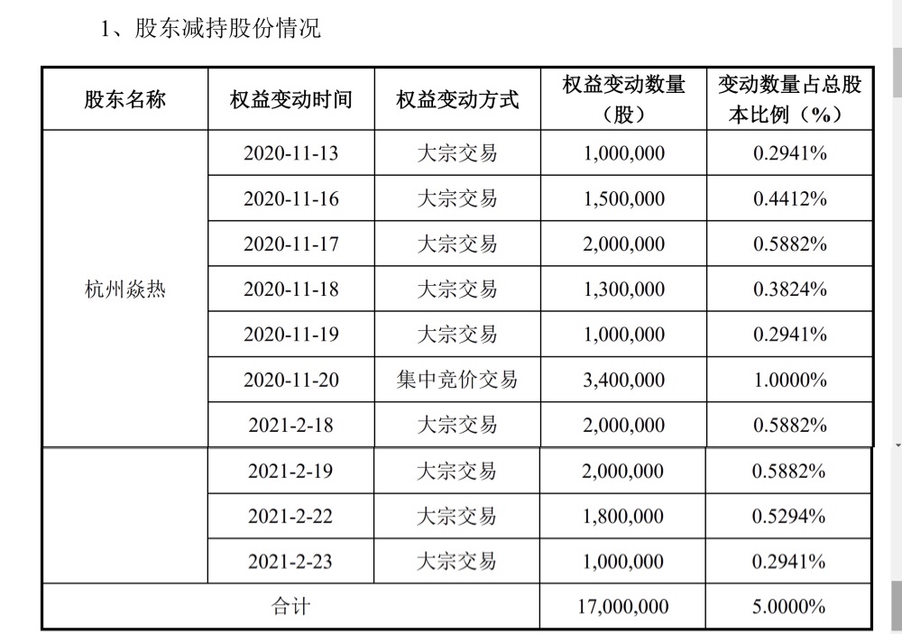 據(jù)悉,杭州焱熱因違約已多次遭被動(dòng)減持。公告顯示,2020年11月13日至2021年2月23日,杭州焱熱因股票質(zhì)押違約被中泰證券通過大宗交易以及集中競(jìng)價(jià)方式處置冀凱股份累計(jì)達(dá)10次。