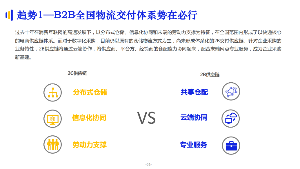數(shù)字化采購(gòu)從政府機(jī)構(gòu)、央國(guó)企、金融機(jī)構(gòu)的陽(yáng)光化采購(gòu)開(kāi)始起步,當(dāng)前正逐步向大型企業(yè)、地方國(guó)企滲透。其中,大型政企客戶對(duì)采購(gòu)服務(wù)商的全國(guó)性交付網(wǎng)絡(luò)和本地服務(wù)體系十分重視。億邦智庫(kù)在報(bào)告中提出,數(shù)字化采購(gòu)市場(chǎng)發(fā)展趨勢(shì)下,B2B全國(guó)物流交付體系勢(shì)在必行。行業(yè)中許多領(lǐng)軍型企業(yè)已經(jīng)在布局全國(guó)的物流交付體系,這對(duì)整個(gè)數(shù)字化采購(gòu)市場(chǎng)的繁榮將起到巨大促進(jìn)作用。報(bào)告也指出,數(shù)字化采購(gòu)將推動(dòng)形成體系化的B2B交付供應(yīng)鏈,并將供應(yīng)商、平臺(tái)方、經(jīng)銷商的倉(cāng)配能力協(xié)同起來(lái),配合末端網(wǎng)點(diǎn)專業(yè)服務(wù),成為企業(yè)采購(gòu)的新基建。